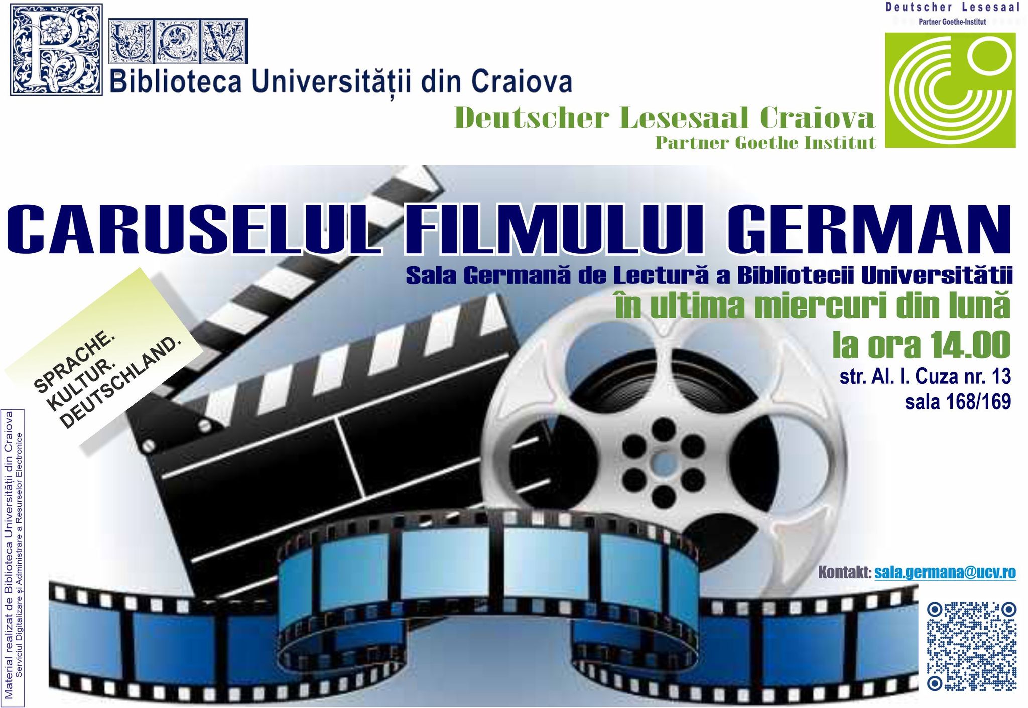 25 februarie 2026 📽️ 𝐒𝐚𝐥𝐚 𝐆𝐞𝐫𝐦𝐚𝐧𝐚 𝐝𝐞 𝐋𝐞𝐜𝐭𝐮𝐫𝐚 𝐢𝐧𝐯𝐢𝐭𝐚 𝐜𝐢𝐭𝐢𝐭𝐨𝐫𝐢𝐢 𝐬𝐢 𝐜𝐨𝐦𝐮𝐧𝐢𝐭𝐚𝐭𝐞𝐚 𝐔𝐧𝐢𝐯𝐞𝐫𝐬𝐢𝐭𝐚𝐭𝐢𝐢 𝐝𝐢𝐧 𝐂𝐫𝐚𝐢𝐨𝐯𝐚 𝐥𝐚 𝐨 𝐧𝐨𝐮𝐚 𝐬𝐞𝐫𝐢𝐞 𝐝𝐞 𝐩𝐫𝐨𝐢𝐞𝐜𝐭𝐢𝐢 𝐝𝐞 𝐟𝐢𝐥𝐦 𝐠𝐞𝐫𝐦𝐚𝐧, 𝐢𝐧 𝐮𝐥𝐭𝐢𝐦𝐚 𝐦𝐢𝐞𝐫𝐜𝐮𝐫𝐢 𝐝𝐢𝐧 𝐥𝐮𝐧𝐚! Un spațiu de întâlnire între film, cultură și dialog, unde poți să te bucuri de experiențe cinematografice. Un mix de cultură, film și vibe studențesc! Poveștile cinematografice germane, aduse pe ecran de regizori și actori germani îți oferă șansa să descoperi teme relevante ale societății germane, perspective culturale diverse și stiluri cinematografice autentice. Fie că ești pasionat de limba germană sau de cinema, aici vei găsi povești care te fac să gândești mai empatic, să descoperi lucruri noi și, uneori, chiar să te redescoperi pe tine. Subtitrările se pot alege în mai multe limbi de circulație internațională, la opțiunea participanților. 🎬 Vizionările au loc în Sala Germană de Lectură, iar 📌𝐚𝐜𝐜𝐞𝐬𝐮𝐥 𝐞𝐬𝐭𝐞 𝐥𝐢𝐛𝐞𝐫, 𝐢𝐧 𝐥𝐢𝐦𝐢𝐭𝐚 𝐥𝐨𝐜𝐮𝐫𝐢𝐥𝐨𝐫 𝐝𝐢𝐬𝐩𝐨𝐧𝐢𝐛𝐢𝐥𝐞. 🎬 !𝐂𝐚𝐫𝐮𝐬𝐞𝐥𝐮𝐥 𝐟𝐢𝐥𝐦𝐮𝐥𝐮𝐢 𝐠𝐞𝐫𝐦𝐚𝐧, acum, l𝐚 𝐒𝐚𝐥𝐚 𝐆𝐞𝐫𝐦𝐚𝐧𝐚 𝐝𝐞 𝐋𝐞𝐜𝐭𝐮𝐫𝐚. 𝕱𝖔𝖆𝖗𝖙𝖊 𝖆𝖕𝖗𝖔𝖆𝖕𝖊 𝖉𝖊 𝖙𝖎𝖓𝖊, în regia Almut Getto. Philipp, un tânăr funcționar bancar, retras și destul de pierdut în propria rutină, are o viață ce pare calmă și previzibilă, dar în spatele acestei aparente normalități se ascund emoții pe care nu știe cum să le gestioneze. Pentru el, apropierea de ceilalți este complicată, iar granița dintre ce simte și ce arată devine tot mai neclară. Întâlnirea cu o tânără muziciană îi dă peste cap echilibrul și îl forțează să iasă din zona de confort. Filmul surprinde acest proces într-un mod calm, dar intens, cu multă discreție, prin gesturi simple, tăceri și momente care spun mai mult decât replicile. Vă așteptăm luna viitoare, tot pe 25, la o nouă proiecție de film german!